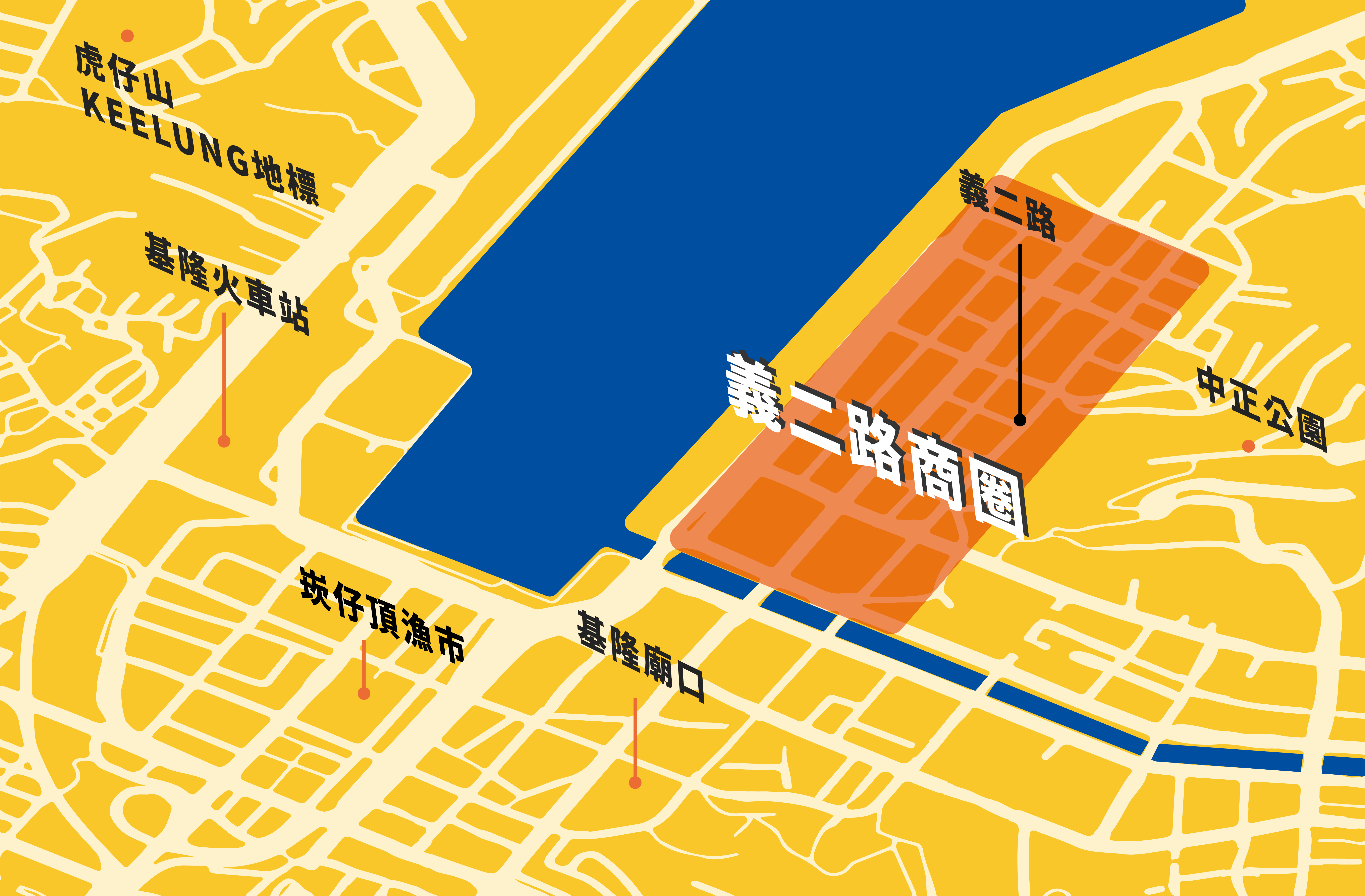 義二路西臨「基隆港」,東靠中元祭「主普壇」與「中正公園」,南接「廟口夜市」,北面延伸則可到達「沙灣歷史文化園區」。
