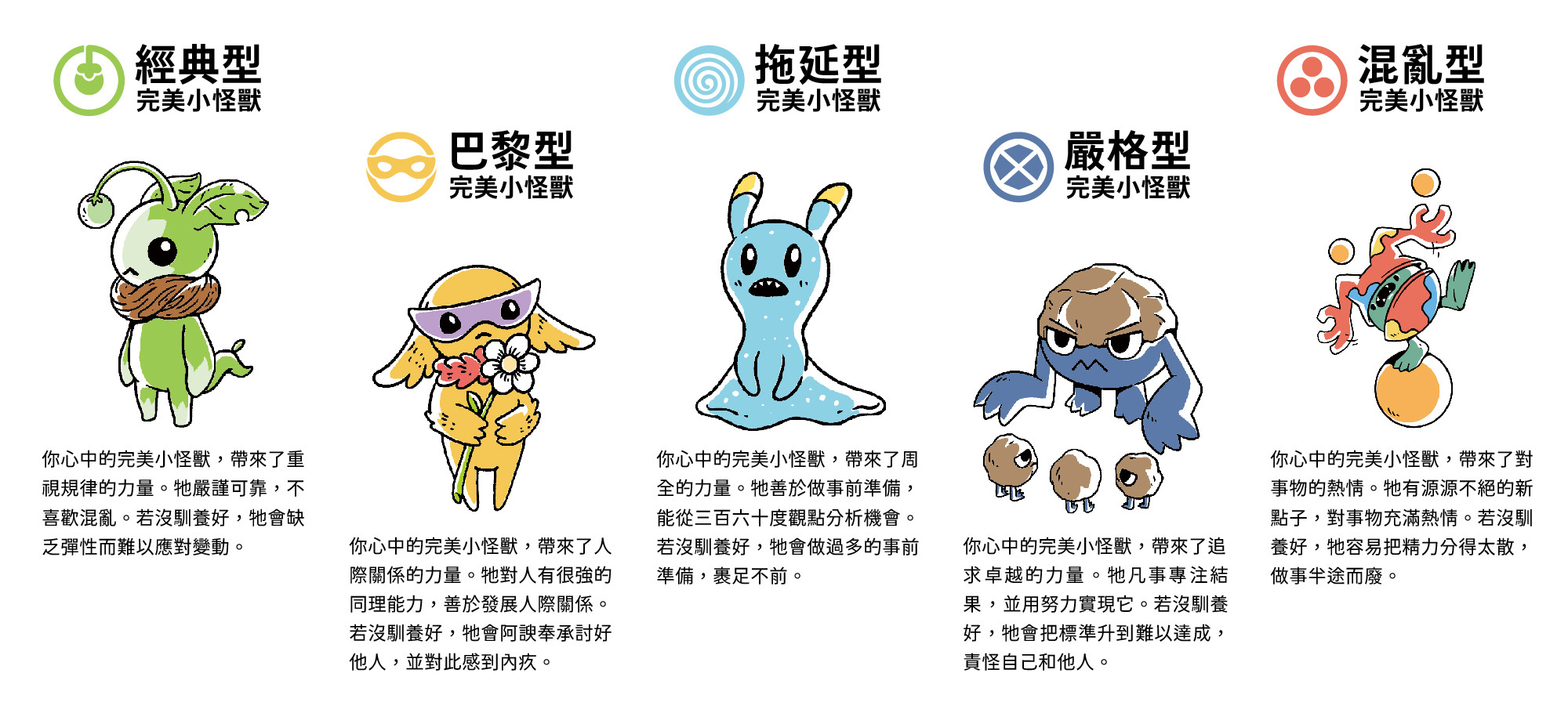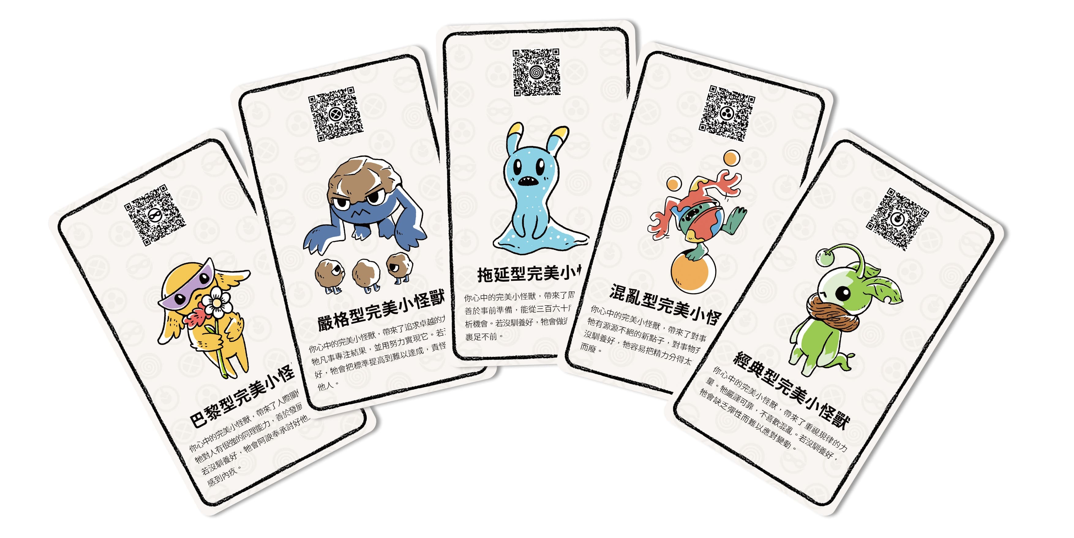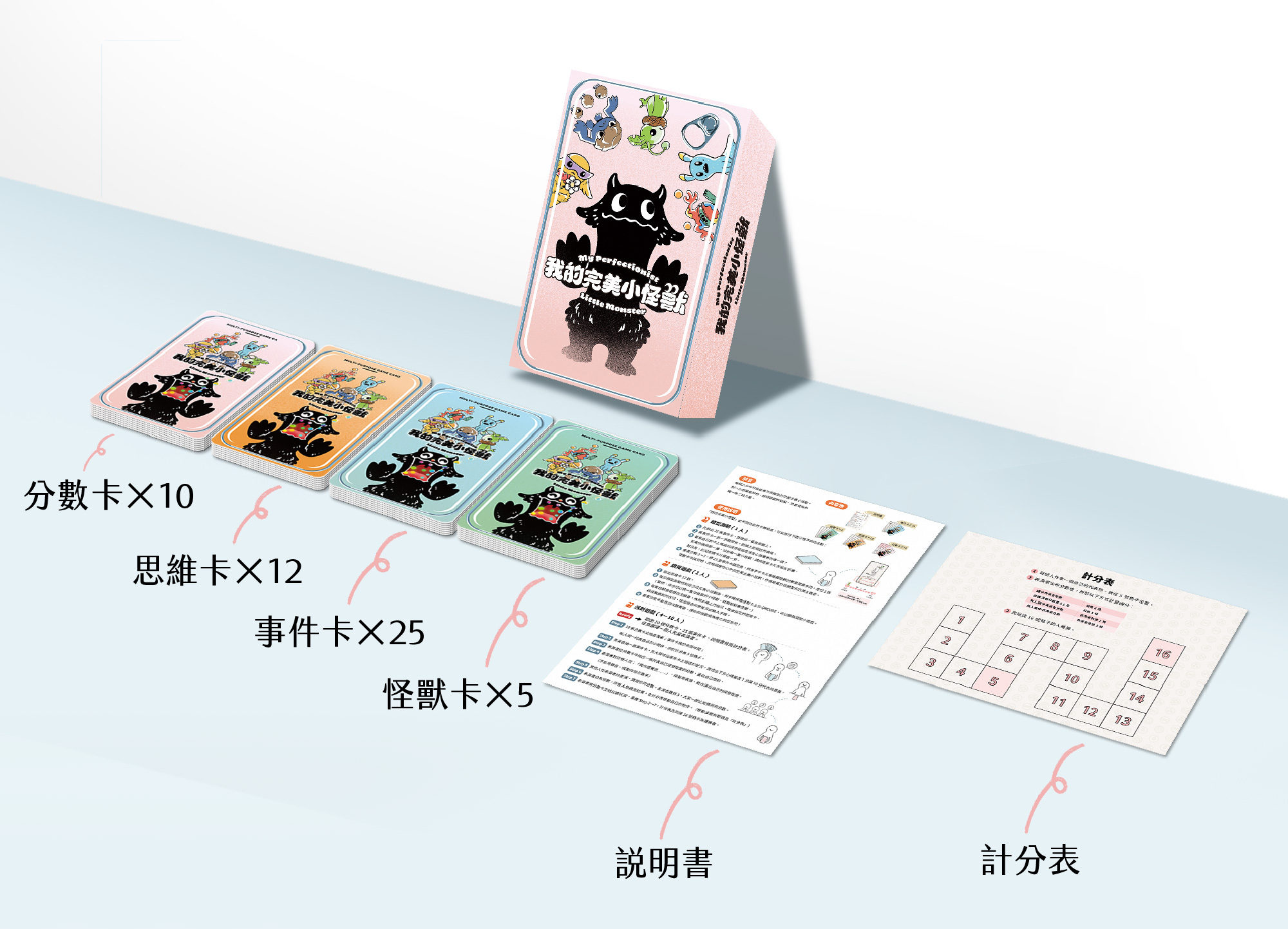 《我的完美小怪獸》多功能卡牌延伸此概念,設計了五隻各有特點的小怪獸。身為小怪獸的飼主,你將看到苦惱的牠們,其實背後擁有著重視規律、建立關係、考慮周全、懷抱熱情、追求卓越等強大的力量!