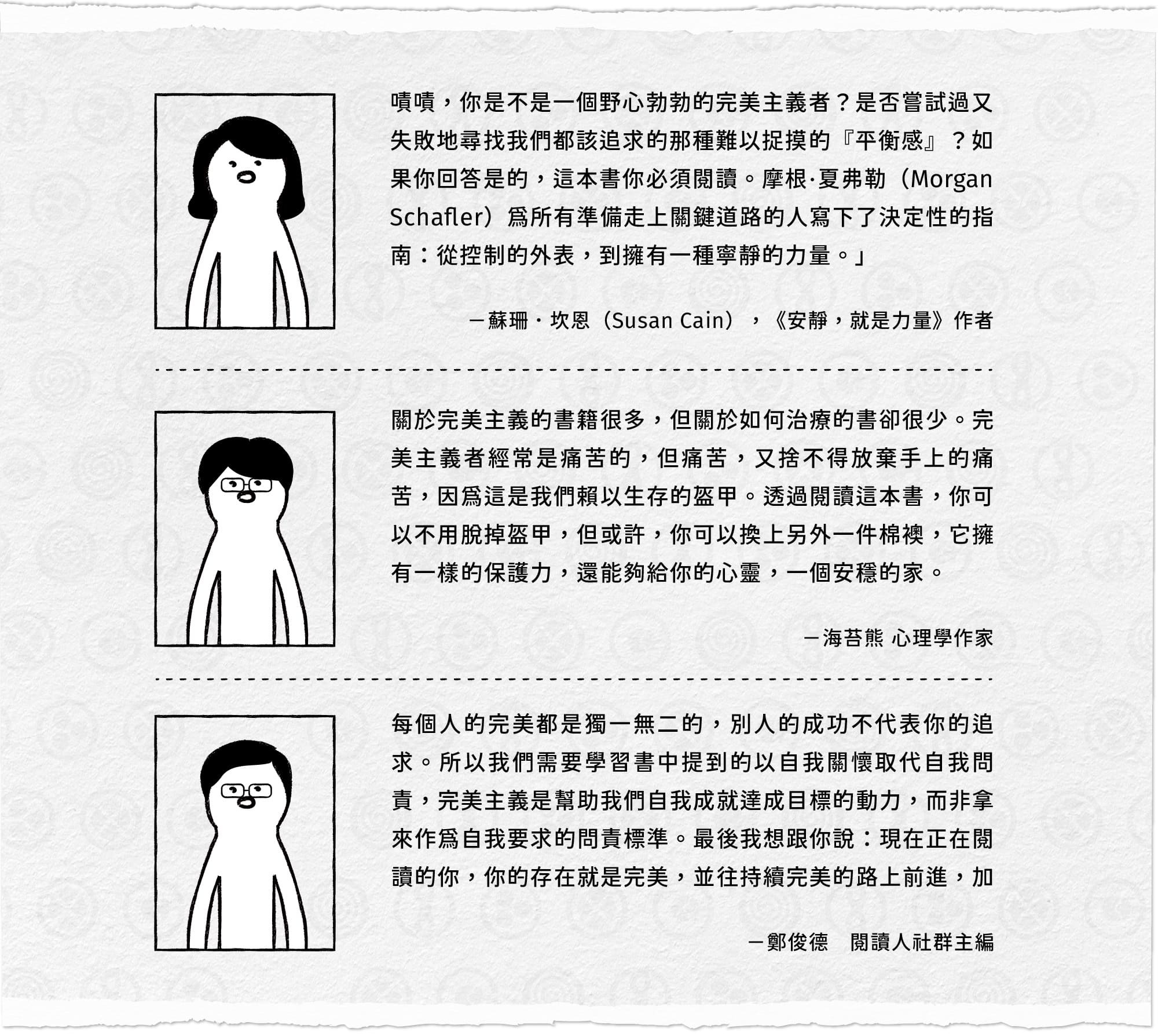 紐約人氣心理諮商師舍弗勒(Katherine Morgan Schafler)整合心理學理論與豐富的諮商經驗,將完美主義分為五個類型,提出十個思考轉化練習與八個行動策略,停止自我苛責、過度內耗、否定自己,維持內在恆定,到哪裡都發光!