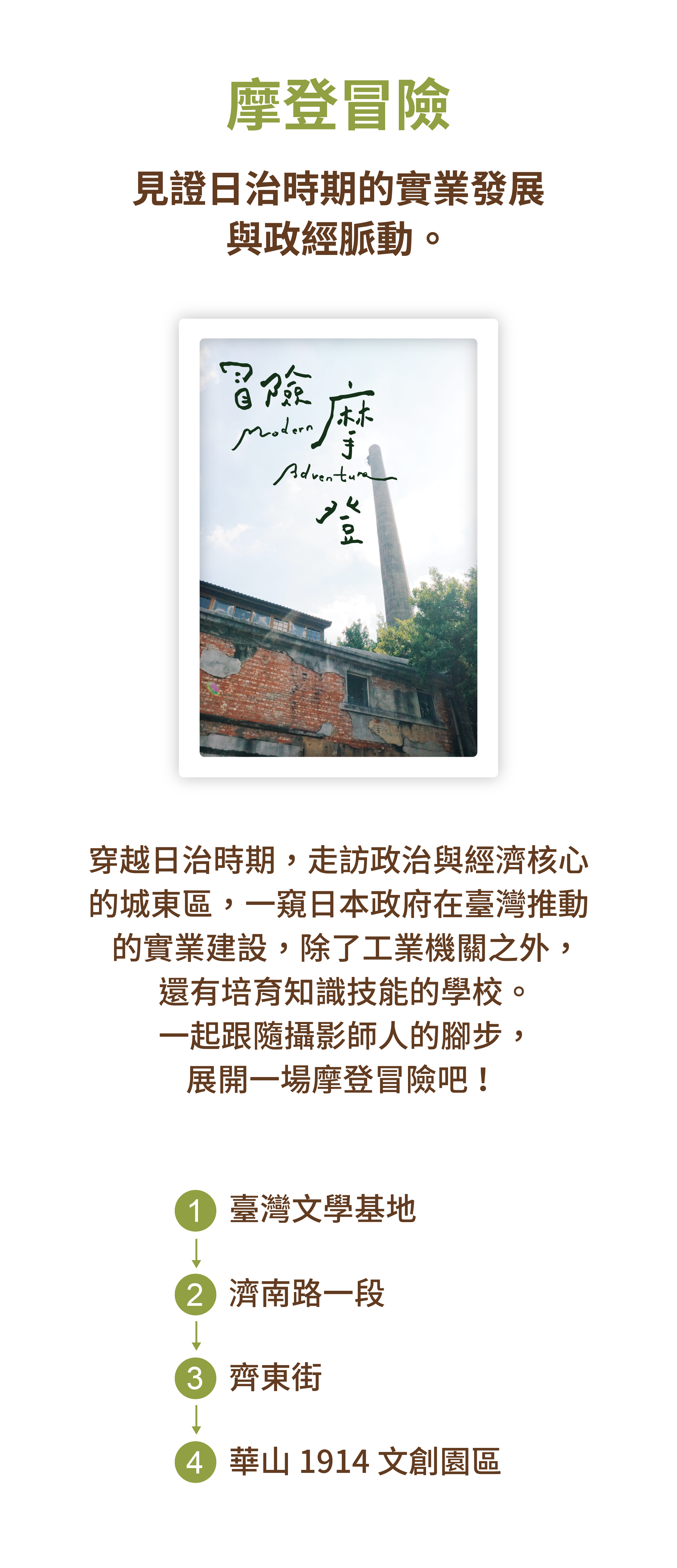 華⼭ 1914 ⽂創園區 × 臺灣⽂學基地 × 善導寺 × 榕錦時光生活園區 × 東門永康街⋯⋯?