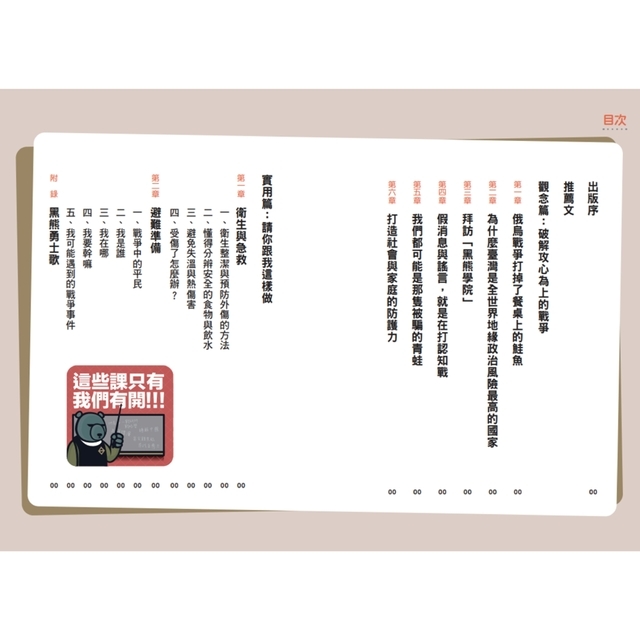 ★透過孩子日常視角探討民防與戰爭,以對話創造輕鬆易讀的形式,深入淺出的知識,奠定孩子的基礎民防觀念。